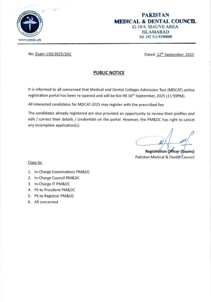 This decision has been taken with respect to their decision regarding MDCAT 2025 delay. Because the date was extended, therefore, a lot of candidates are demanding PMDC to reopen registration portal which PMDC also have accepted and reopened the portal.